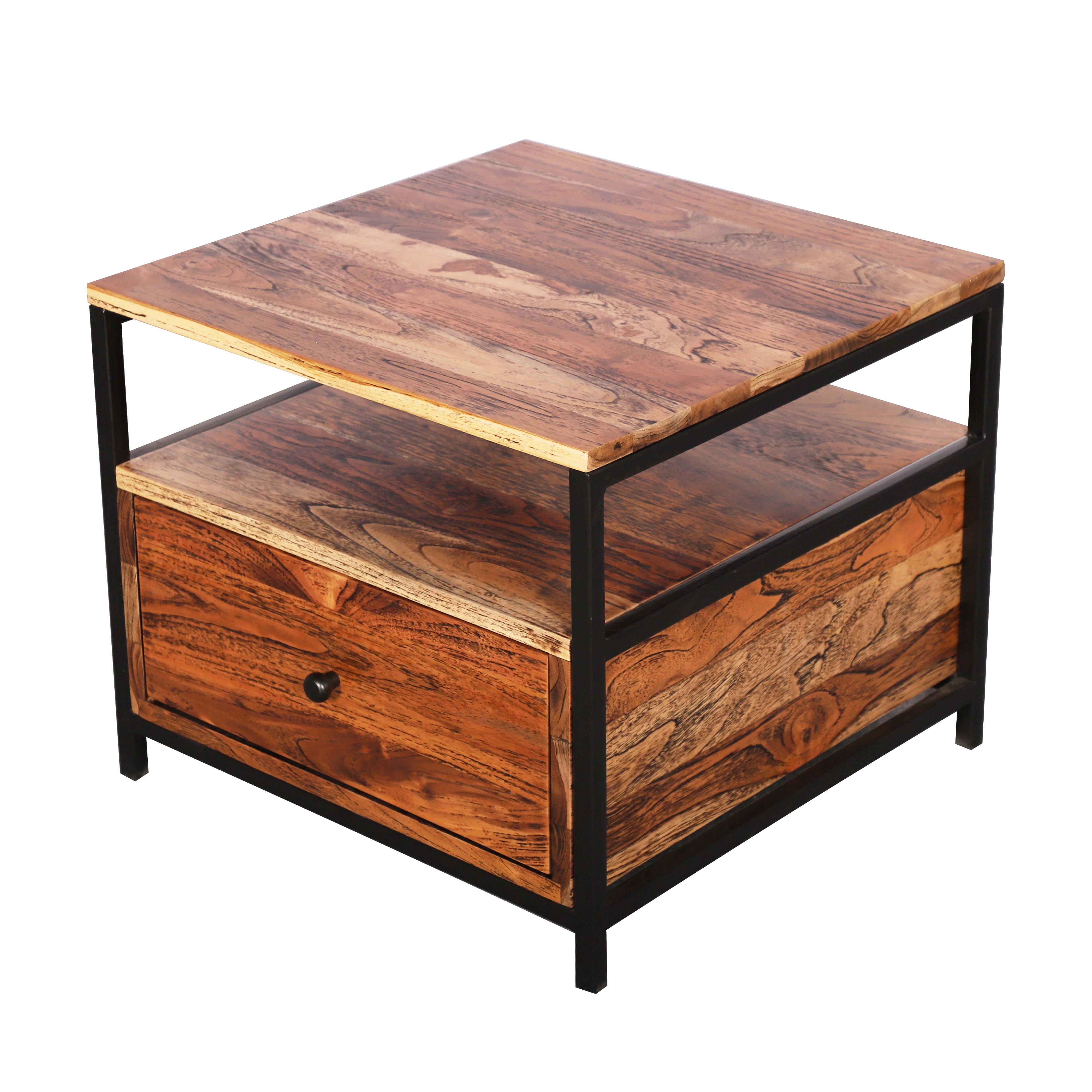 DescriptionMaterial - Sagwan wood Product Size : (lxbxh) 55X55X40 cm Packing Size : 60X60X50 cm Knocked Down : No Packaging Colli in nos : 1 Color :- weatherwood finish Metal frame :- Black paint No of drawer :-1 No of shelves :- 1