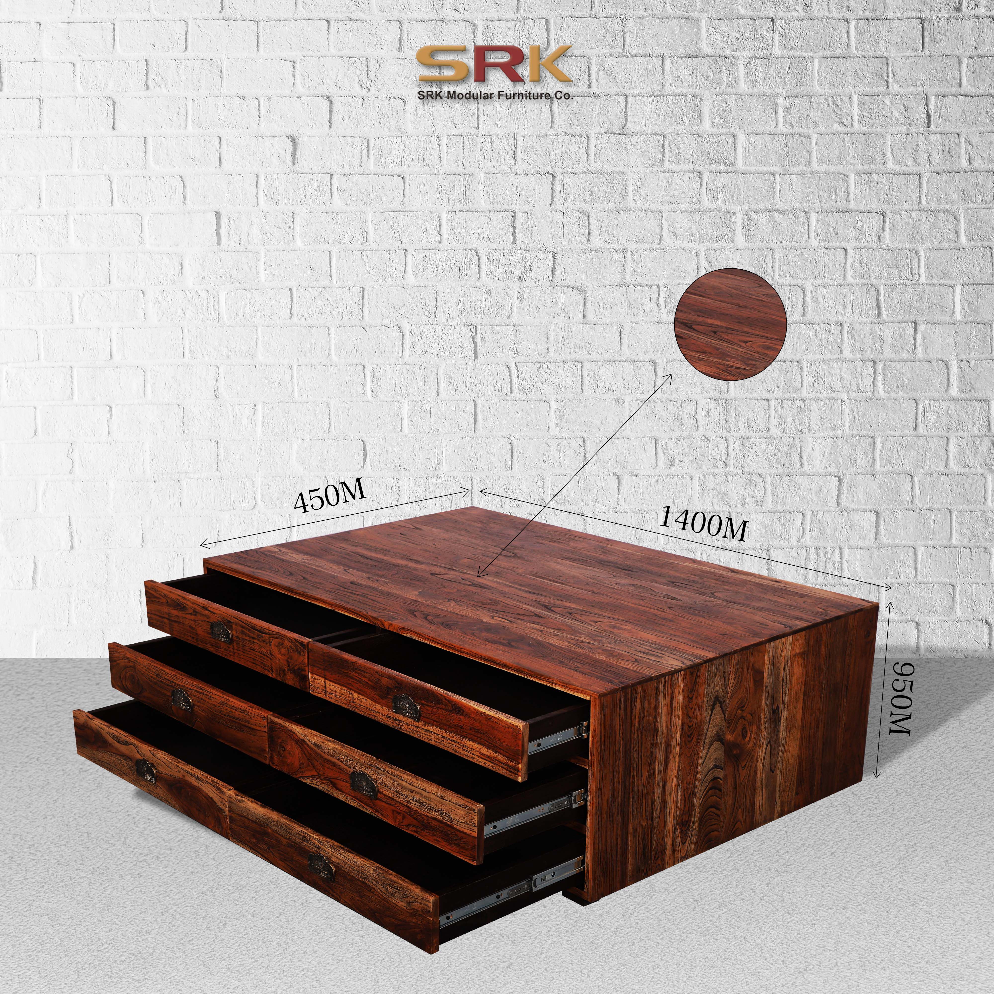 DescriptionProduct Size : (lxbxh) 140X95X45 cm Packing Size : 150X105X55 cm Knocked Down : No Packaging Colli in nos : 1 Product Shape : Rectangular Color : Weather wood finish No of Drawer :- 12